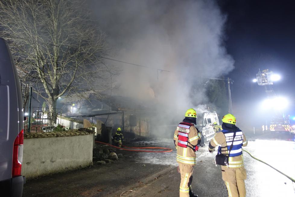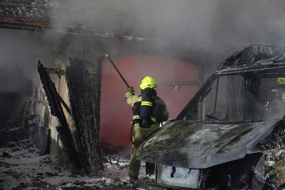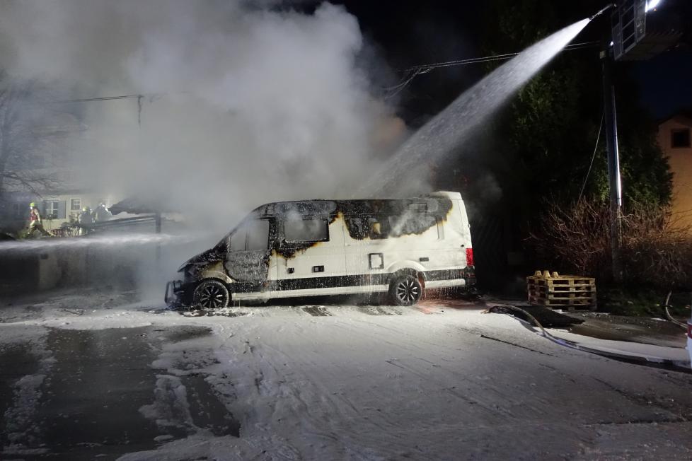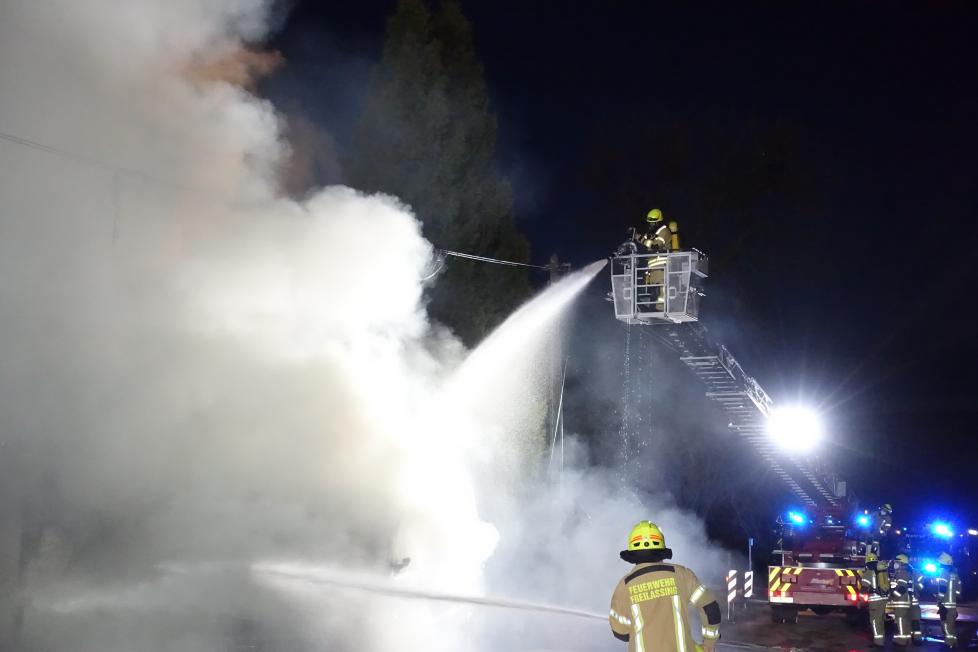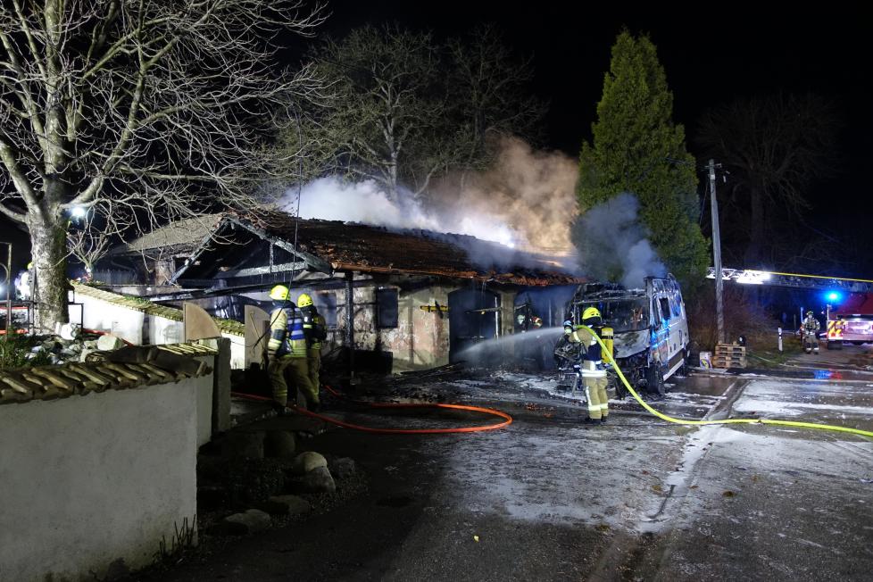 Garagenbrand: Feuerwehr rettet Wohnhaus vor den Flammen ![]() Bereits auf der Anfahrt war eine starke Rauchentwicklung sichtbar. So wurde auch schon auf der Anfahrt des Einsatzleitwagens die Alarmierung der Freiwilligen Feuerwehr Surheim veranlasst. Die ersten Freilassinger Kräfte mit dem Hilfeleistungslöschfahrzeug bauten sofort eine Widerstandslinie zwischen der im Vollbrand stehenden Garage und dem direkt daneben stehenden Wohnhaus auf. Das zweite Freilassinger Löschfahrzeug begann mit der Brandbekämpfung von der Rückseite der Garage her und wurde dazu von der Drehleiter aus mit einem weiteren Rohr unterstützt. Auf dieser Seite kamen auch die Kameraden der Freiwilligen Feuerwehr Surheim zum Einsatz. Somit konnte ebenfalls ein Übergreifen auf einen direkt daneben stehenden Schuppen verhindert werden. Ein vor der Garage stehendes Wohnmobil, das bereits im Vollbrand stand, als die ersten Kräfte eintrafen, brannte dagegen, ebenso wie ein in der Garage abgestelltes Fahrzeug und zwei Motorräder völlig aus. Personen kamen bei dem Brand zum Glück nicht zu Schaden, so dass sich das alarmierte Bayerische Rote Kreuz nur vorübergehend um die betroffenen Personen kümmern musste und den Atemschutz-Einsatz der Feuerwehr absicherte.